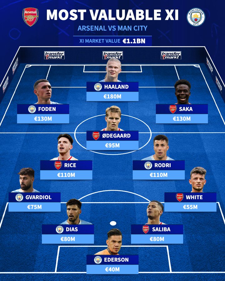 03月31日讯 北京时间今天晚上23点30分,曼城将在英超第30轮比赛中主场对阵阿森纳。赛前,德转列出两队的最贵11人阵容,哈兰德1.8亿欧领衔。