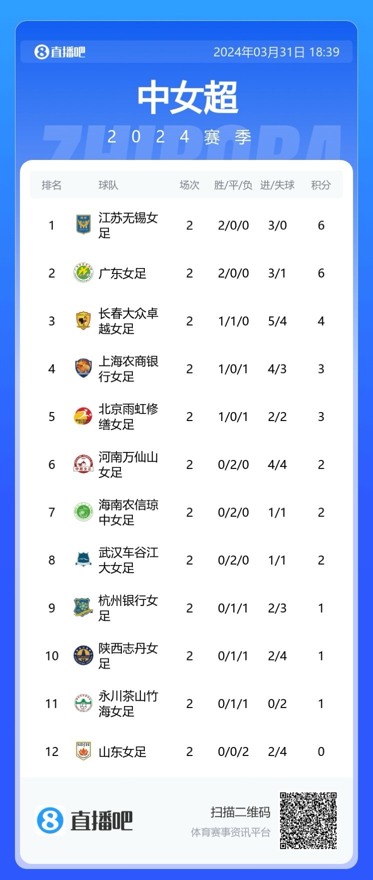 3月31日讯 今天下午15点,女超第2轮结束最后3场较量,广东女足1-0击败上海农商银行女足开局两连胜,江苏女足1-0北京女足同样取得两连胜,并以净胜球优势领跑。