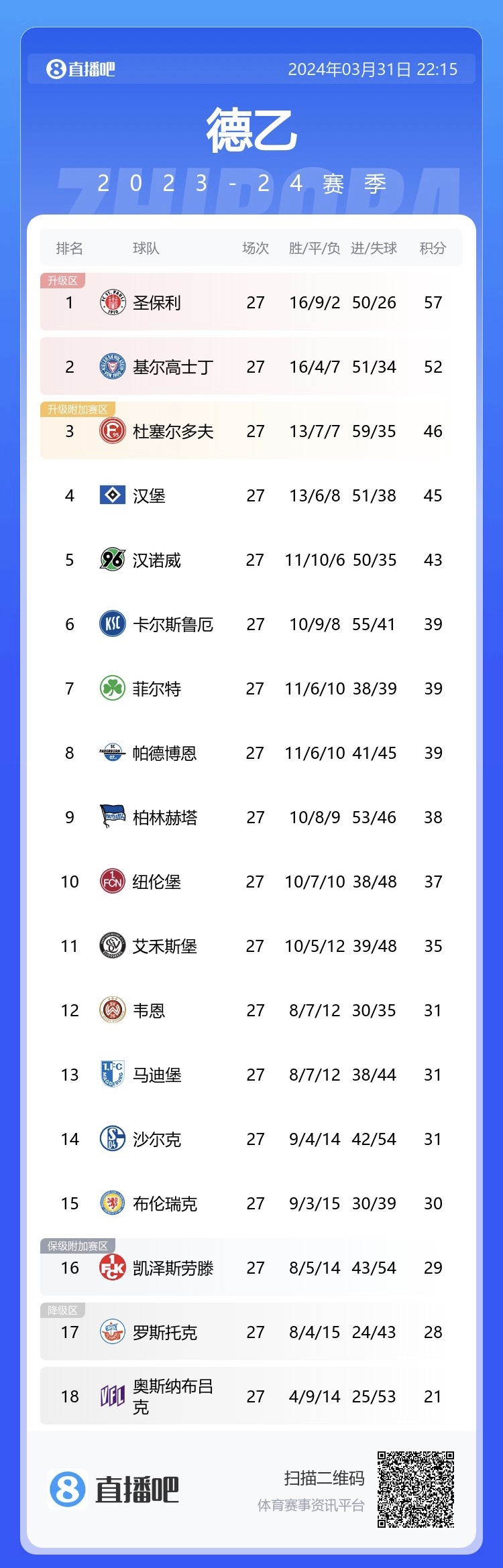 03月31日讯 德乙第27轮,汉堡客场1-1战平菲尔特。本轮战罢,3连胜的杜塞尔多夫升至第三,近4轮1胜1平2负的汉堡跌至第四。