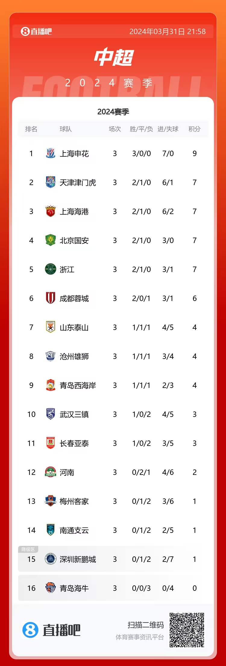 03月31日讯 中超第3轮,山东泰山主场0-3不敌上海申花,浙江2-1战胜梅州客家。申花3连胜强势登顶,三场打进7球1球未丢,浙江升至第5,泰山遭遇赛季中超首败,跌至第7,梅州仍未取赛季首胜。