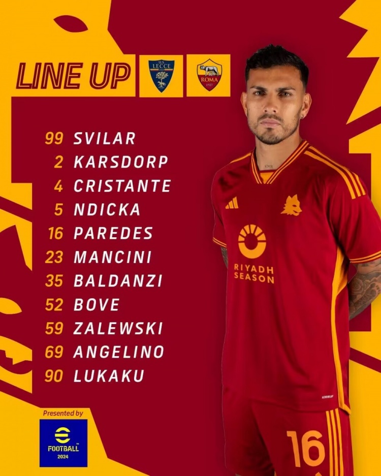 罗马首发:99-斯维拉尔、2-卡尔斯多普、5-恩迪卡、23-詹卢卡-曼奇尼、69-安吉利诺、4-克里斯坦特、16-帕雷德斯、52-博维、35-巴尔丹齐、90-卢卡库、59-扎莱夫斯基