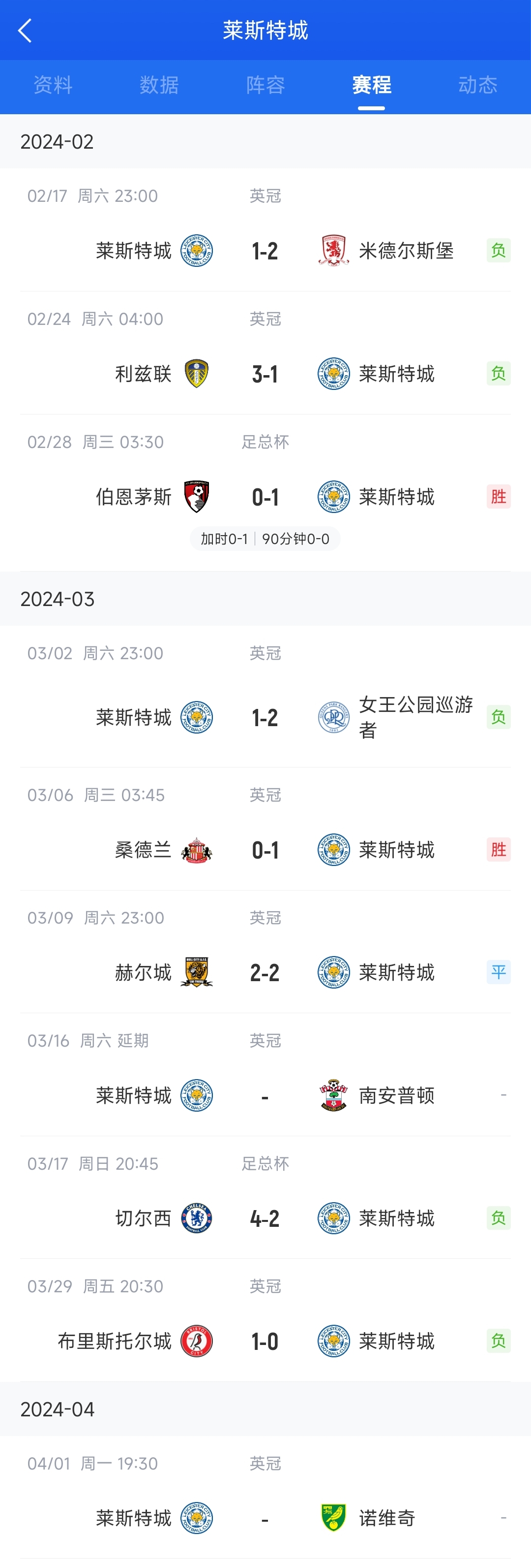 莱斯特城此前战绩: