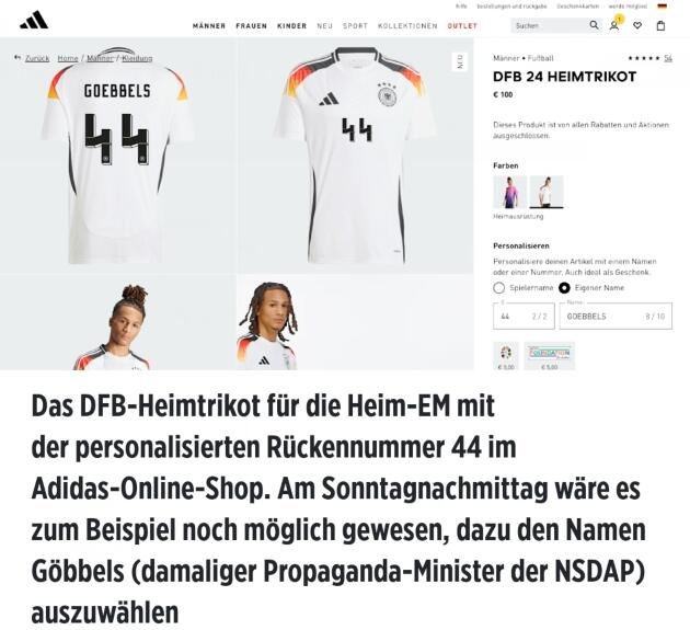 阿迪达斯前不久发布了欧洲杯球衣,包括德国队,西班牙队,比利时队,意大利队等,并专门设计了球衣号码字体。但有人发现,阿迪达斯的44号球衣,看起来很像是纳粹党卫军标识SS,球迷在阿迪达斯官网定制球衣选择号码和自定义姓名时,甚至可以搭配44号(像是SS)+戈培尔(纳粹德国宣传部长)。