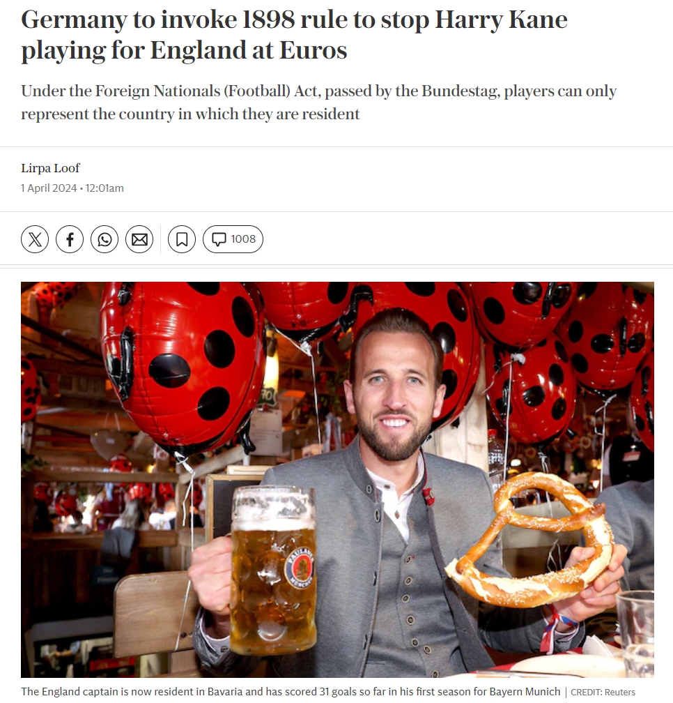 电讯报在英国时间4月1日12点发文:德国人打算通过一项1898年制定的法规阻止凯恩参加欧洲杯。