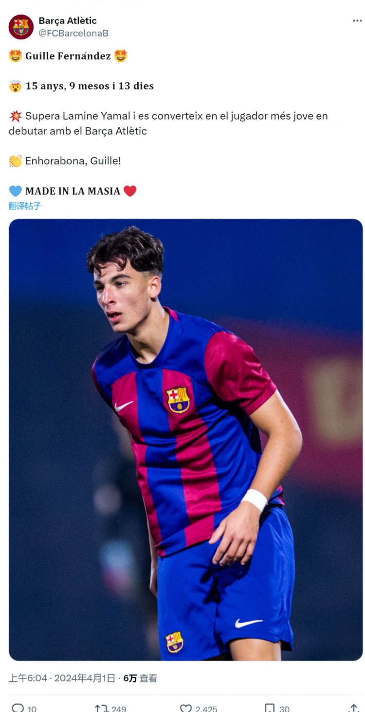 据巴萨官方统计,现年15岁287天的费尔南德斯打破亚马尔的纪录(15岁297天),成为在巴萨B队首秀最年轻的球员。