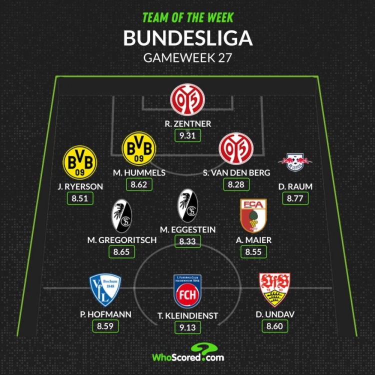 4月1日讯 WhoScored评选出了德甲第二十七周的最佳阵容,没有拜仁的球员入选。