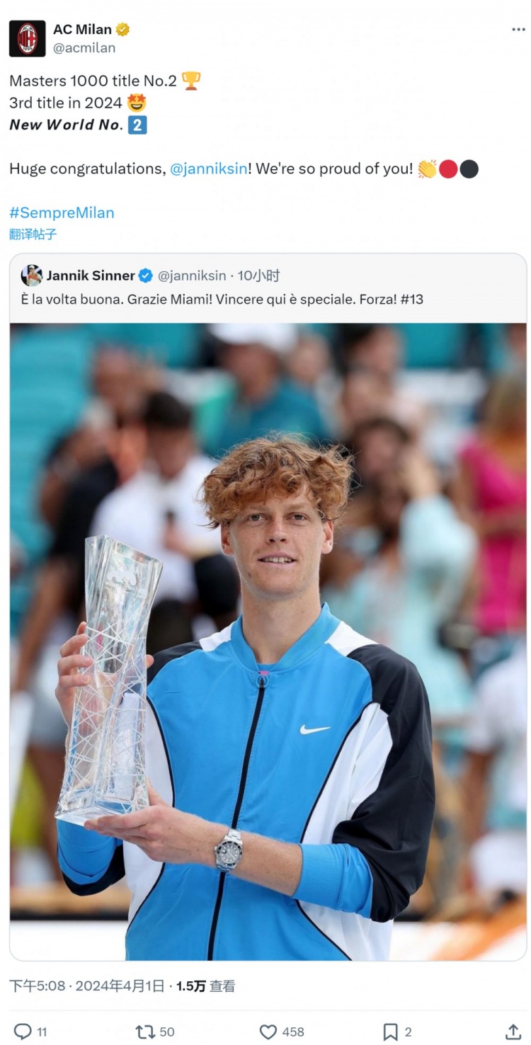 辛纳在迈阿密大师赛决赛中直落两盘击败迪米特洛夫,斩获冠军奖杯,米兰官方账号转发辛纳的夺冠社媒动态,并写道:“第二座ATP1000大师赛冠军奖杯,2024年第三冠,新科世界第二。”