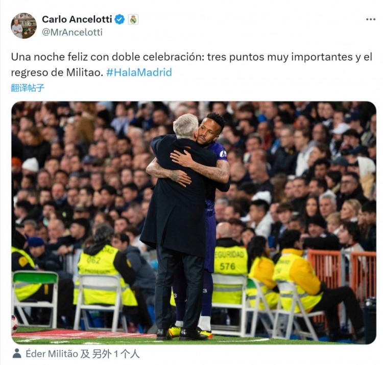 安切洛蒂晒出自己与米利唐拥抱的照片,并写道:“这是一个双喜临门的快乐夜晚——获得重要的三分和米利唐回归。”