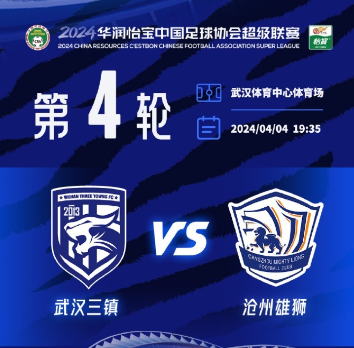 4月4日19:35,武汉三镇将在2024赛季中超联赛第4轮中主场对阵沧州雄狮。连续主场作战,期待在看台上再次看到大家助威跳跃的身影,重振旗鼓,我们一起为武汉、为三镇而战!