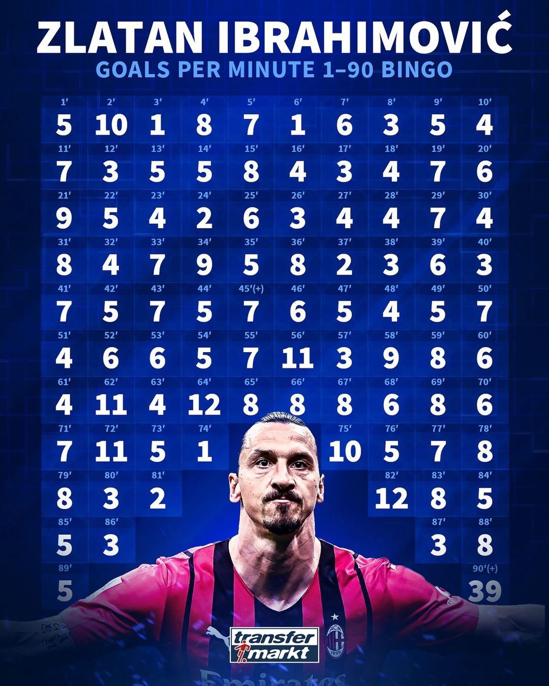 伊布每分钟均有进球,90分钟+进球数达39球。据德转数据,伊布俱乐部生涯827场496球204助,国家队生涯122场62球25助。
