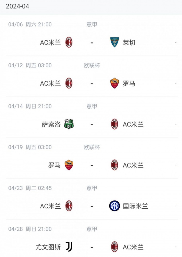 米兰本赛季还剩意甲和欧联两条战线,4月将在欧联1/4决赛先主后客对阵罗马,之后在联赛中连战榜首国米和第三尤文。