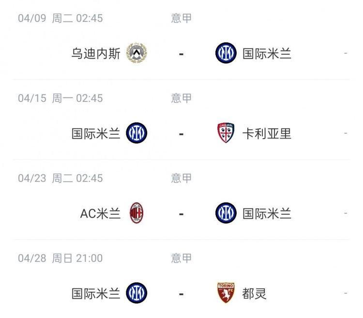 国米4月意甲赛程:客场对乌迪内斯、主场对卡利亚里、客场对AC米兰、主场对都灵