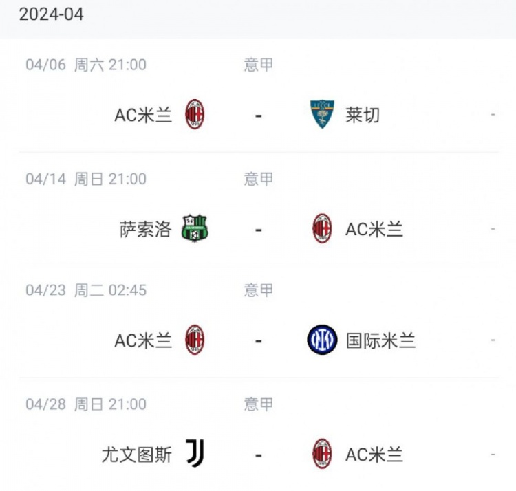 米兰4月意甲赛程:主场对莱切、客场对萨索洛、主场对国米、客场对尤文