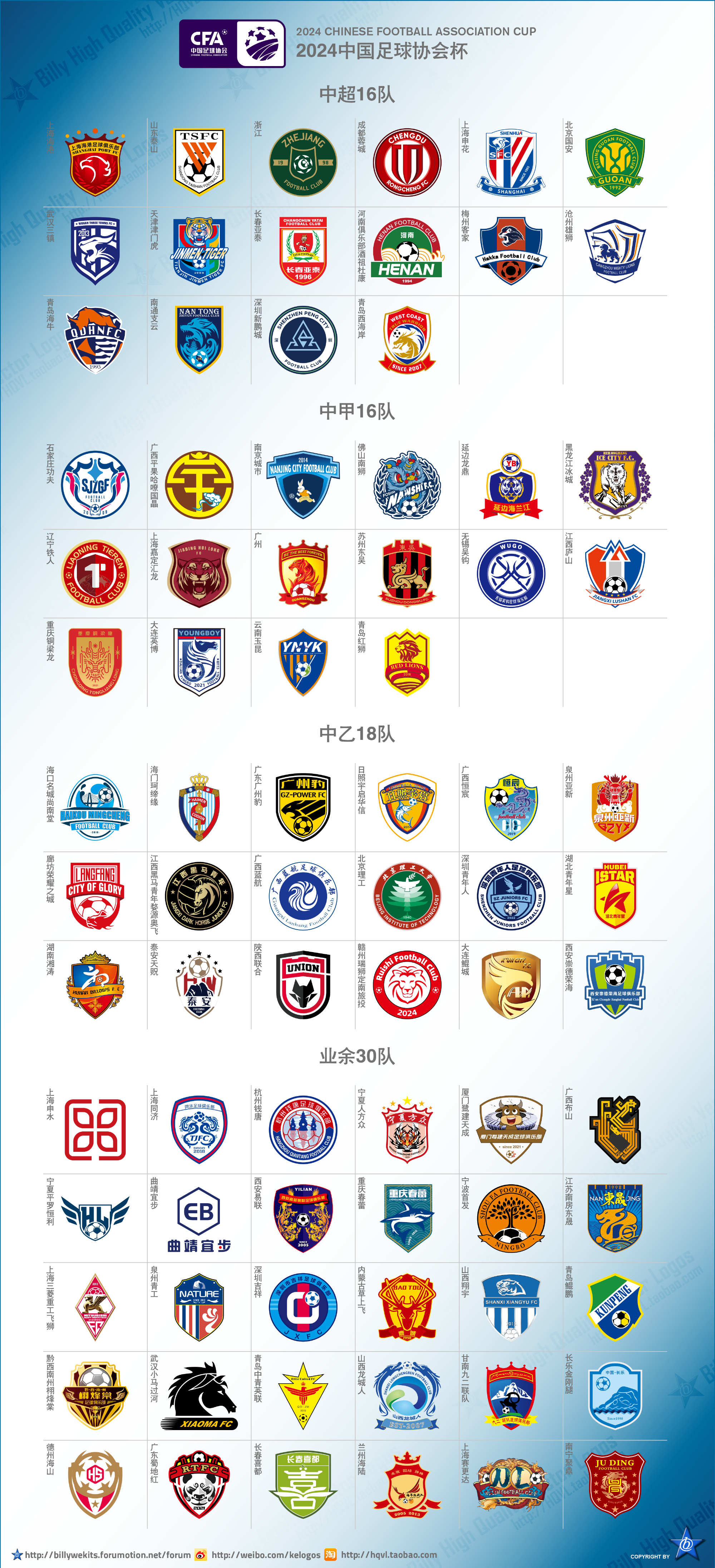 新赛季中国足协杯已经开打,博主“Bi77y”整理了中超、中甲、中乙和业余球队共80支参赛球队的队徽,分别是中超16队、中甲16队、中乙18队以及业余30队。