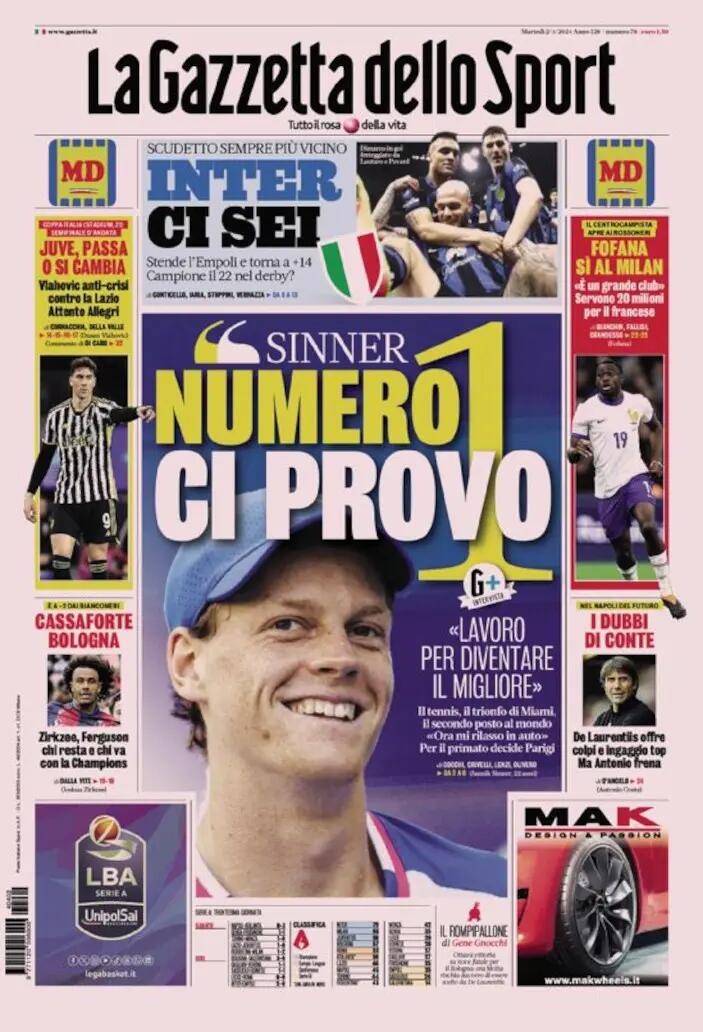 4月2日讯 《米兰体育报》今日(4月2日)头版,国际米兰越来越接近意甲冠军,福法纳示好米兰。