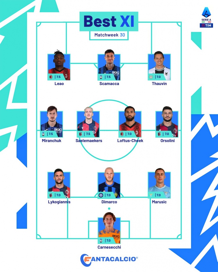 中场:米兰楚克(亚特兰大)、萨勒马科尔斯(博洛尼亚)、奇克(米兰)、奥尔索里尼(博洛尼亚)
