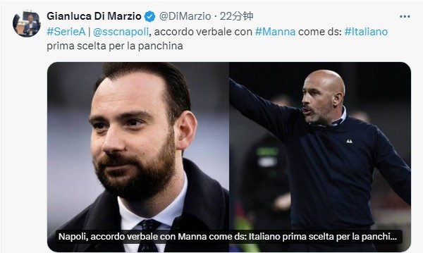 报道称,那不勒斯已经开始为下赛季奠定基础,那不勒斯主席德劳伦蒂斯最近几天和尤文U23总监曼纳就出任体育总监一职达成了口头协议,曼纳已经同意前往那不勒斯任职。