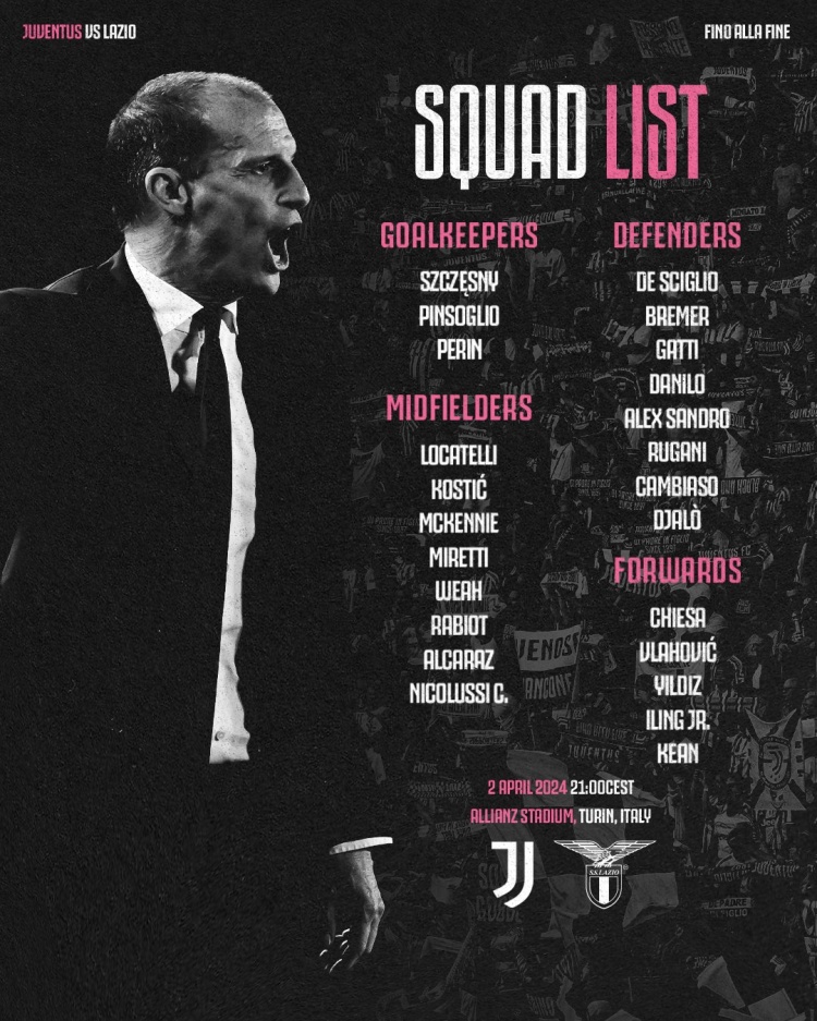 4月2日讯 北京时间明天凌晨3点,尤文将在意大利杯半决赛首回合比赛中主场对阵拉齐奥,尤文公布了此役的球员名单,弗拉霍维奇、基耶萨在列,科斯蒂奇、桑德罗、阿尔卡拉斯回归,米利克继续缺席。