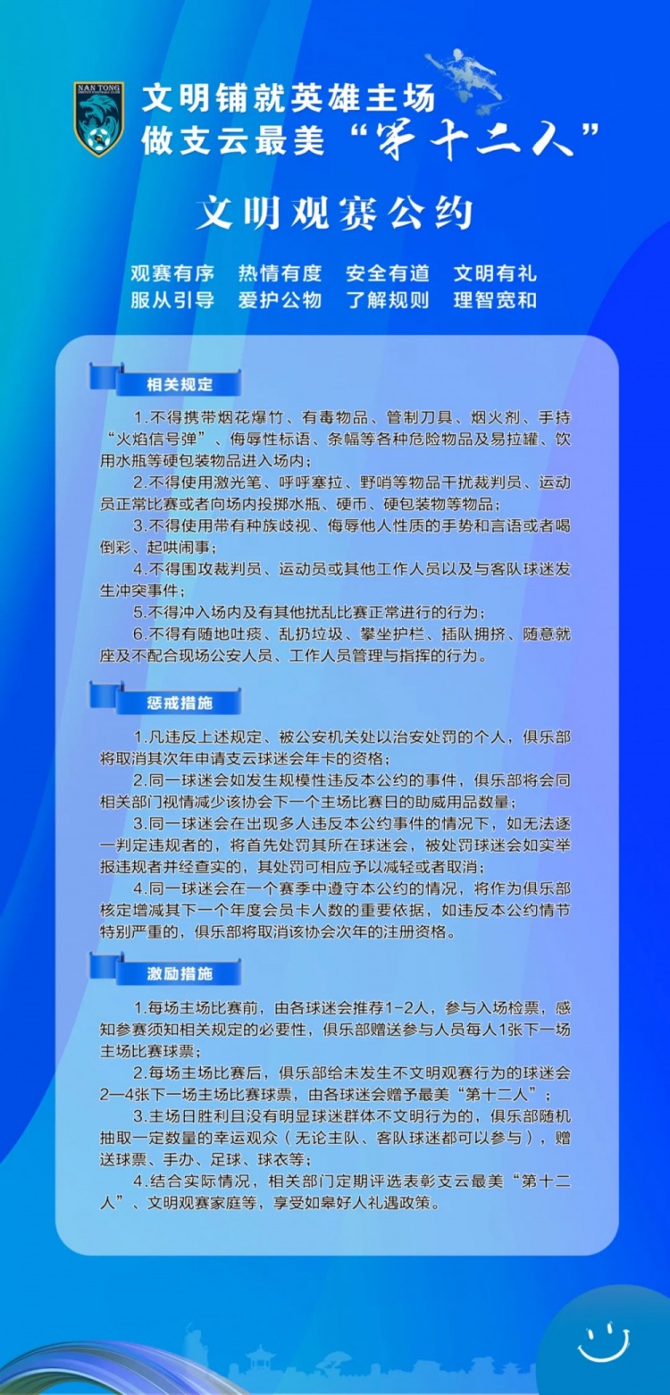 8、观赛球迷需遵守《2024华润怡宝中国足球协会超级联赛[南通支云队主场]观赛须知》。