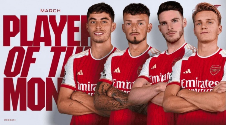 4月2日讯 阿森纳公布了3月最佳球员候选名单,4名候选人分别为哈弗茨、厄德高、赖斯以及本-怀特。