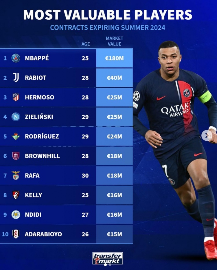 4月2日讯 德转此前更新了足坛球员身价,并盘点了目前合同即将在今夏到期的球员中,身价最高榜单,其中姆巴佩以1.8亿欧高居榜首。以下为具体榜单: