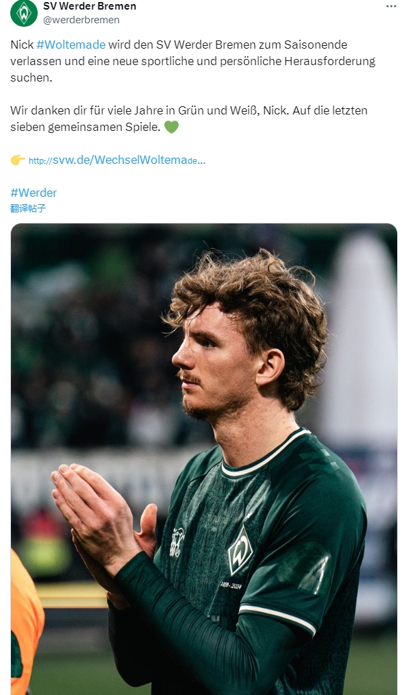 04月03日讯 德甲云达不莱梅足球俱乐部官方宣布,一线队前锋沃特马德(Nick Woltemade)将在今夏离开不莱梅。